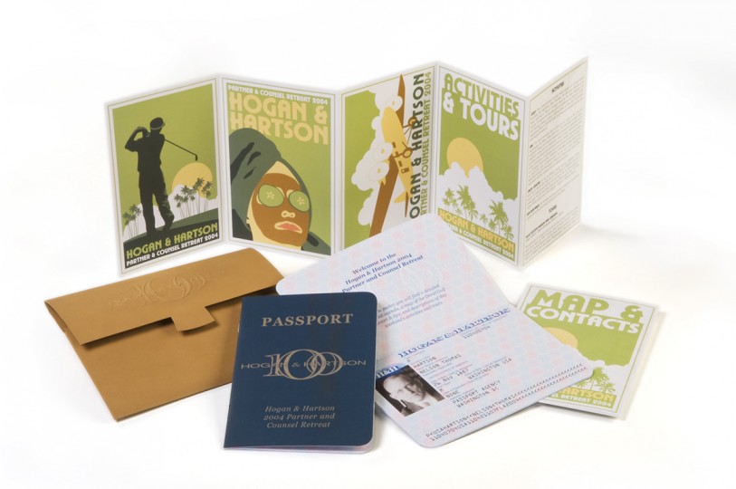 As the oldest major law firm headquartered in Washington, D.C., Hogan & Hartson culminated its 100 year anniversary with a partner retreat. The welcome pack designed for this event was inspired by vintage travel and featured a faux-suede folio with maps, postcards, and one of two replica passports featuring the firm’s named founders.